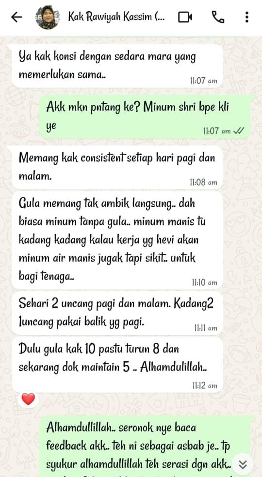Kebanyakan pengguna rasa perubahan tenaga & sendi selepas 5–7 hari. Untuk gula & kolesterol, biasanya dalam 2–3 minggu.